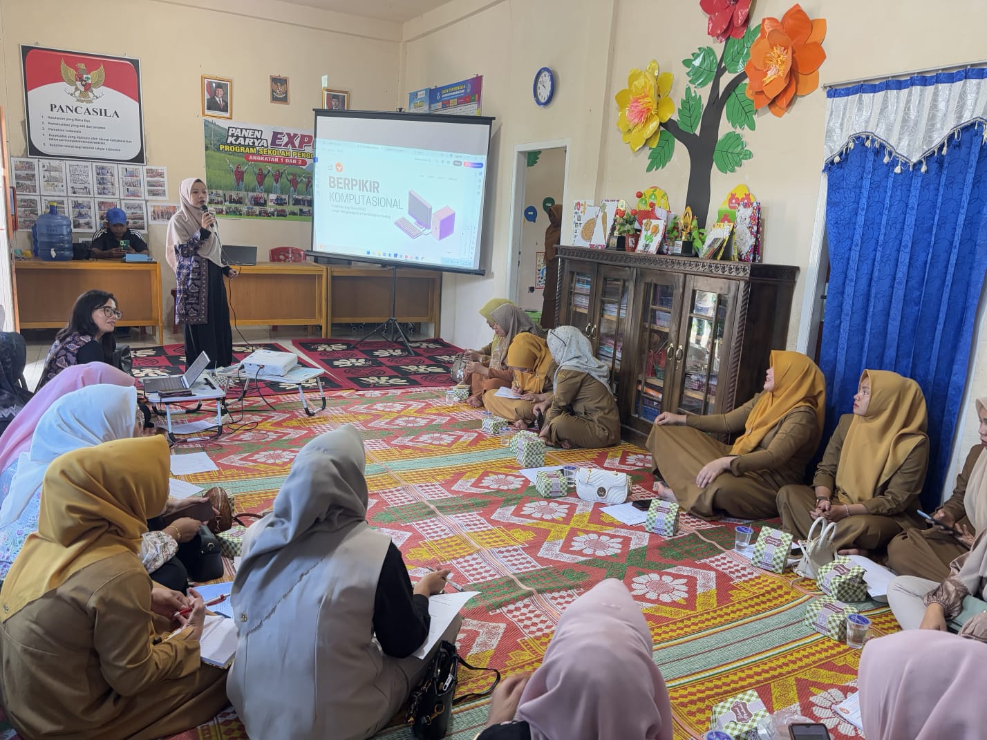 Para peserta pelatihan terlihat antusias mengikuti rangkaian kegiatan. Tidak hanya mendapatkan materi teori, mereka juga diajak melakukan praktik sederhana merancang aktivitas bermain yang mengandung unsur berpikir komputasional.